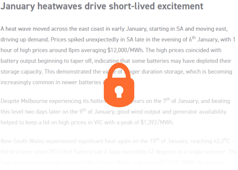 Similarly, compared to 2025, average spot prices in January 2026 were also weaker in all states except South Australia. Queensland prices were 44% lower, with New South Wales and Victorian prices down 20% on a year earlier. South Australian prices were over 3 times higher in January 2026 as heat-driven volatility on 4 days in January drove the average monthly price to its highest level since 2019.