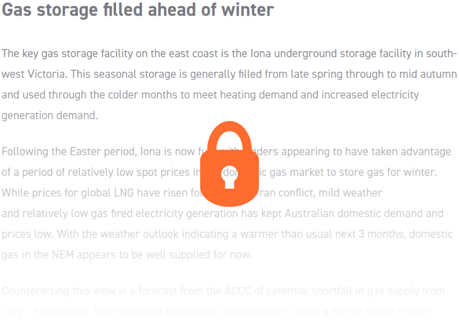 The conflict in the Middle East (which started at the end of February) has disrupted global oil and gas supplies and led to a sharp rise in the price of these commodities. Unlike the impacts of Russia’s invasion of Ukraine, the flow-on impacts of the war on Australian electricity have so far been limited, with domestic gas market prices over the past 6 weeks lower than average on the back of low seasonal demand.