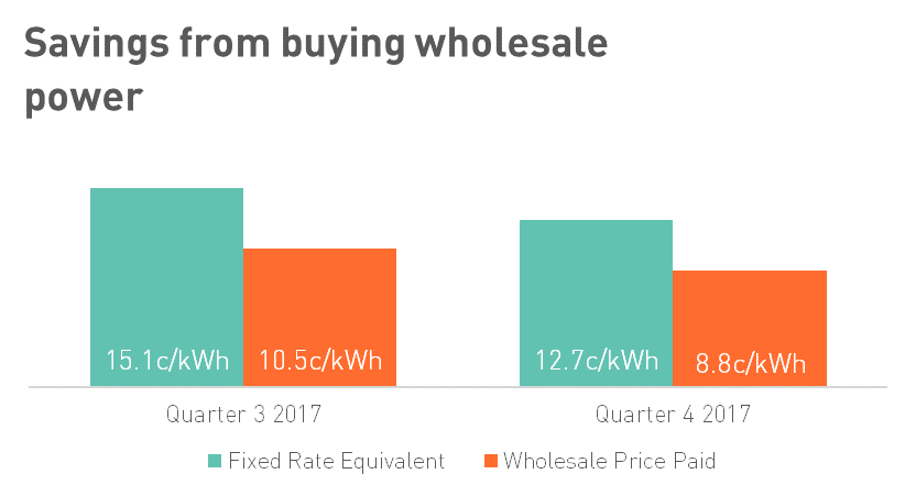 The graph shows the difference in what the business paid for electricity on wholesale compared to the average fixed rate equivalent according to ASX futures.